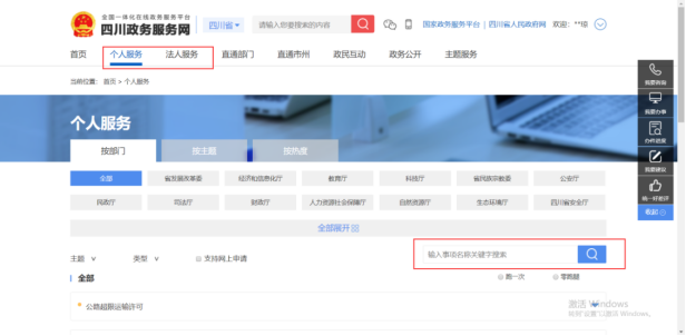2.定位申报事项。有两种方式,可在首页查询输入框中,输入事项名称,进行查询定位;也可以通过首页—>个人服务/法人服务—>事项名称,输入查询定位。