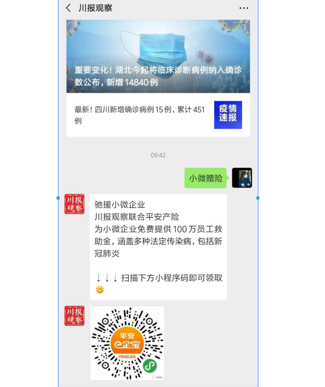 请关注“川报观察”微信公众号(cbgc2014),在微信后台回复“小微赠险”进入申请通道。