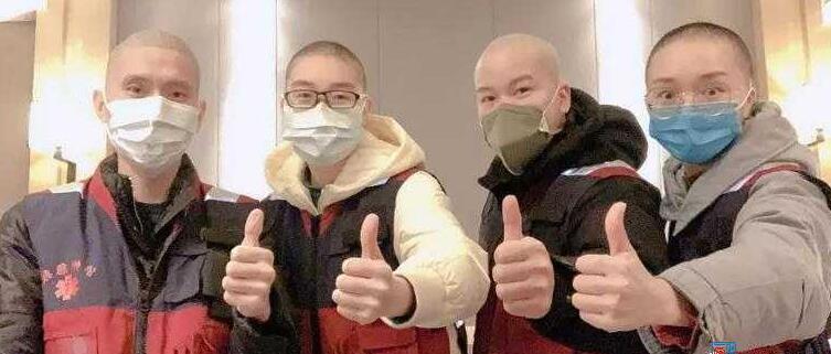 特殊时期,很多理发店关门,很多人没地方打理发型。杨云满、刘铭、余倩和杨莉四人,为了在疫情期间方便穿脱防护服,决定在援鄂入住的酒店内自己进行集体理发,还约定了集体剃光头。