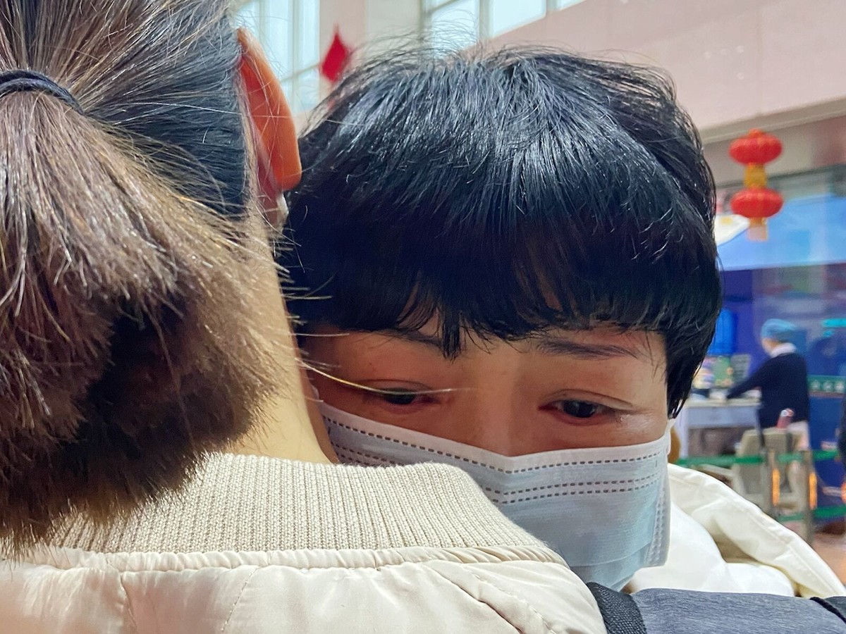 专车最后一排的窗户无法打开,将头前伸出,和家人告别。郭慧琳摄