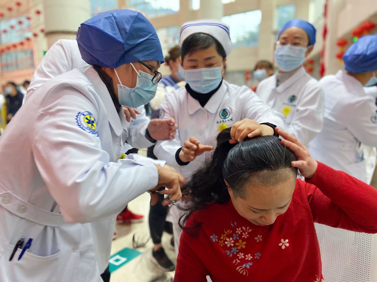 在西南医科大学附属医院门诊大厅,医护人员当起了Tony老师,为即将出征的队员理发。郭慧琳摄