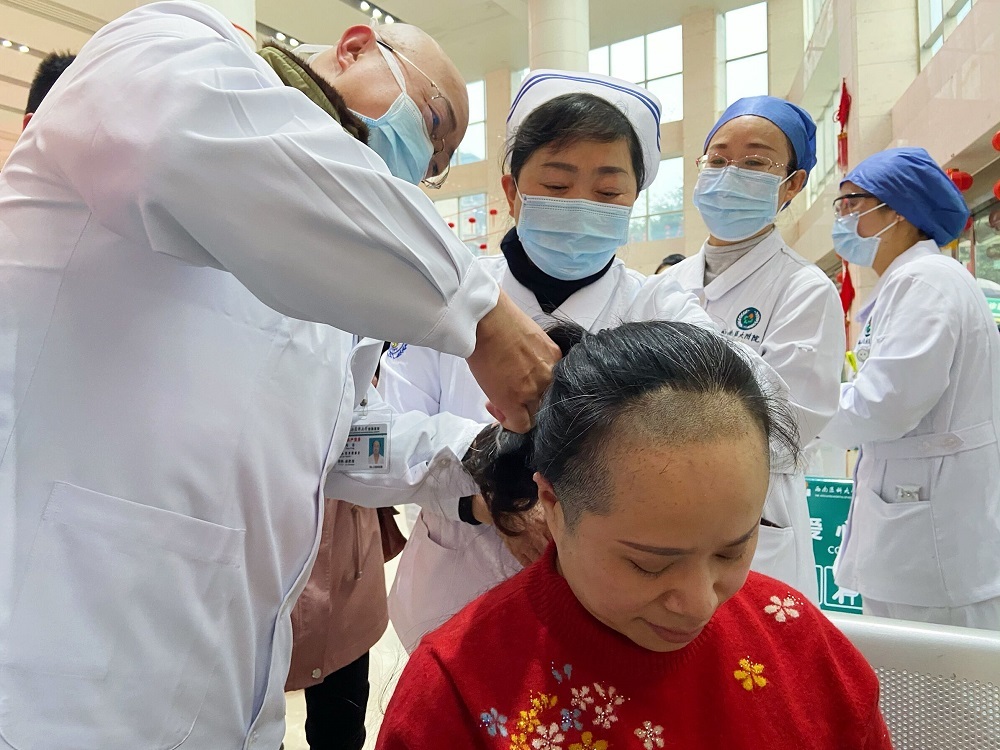 2月13日一大早,西南医科大学附属医院(忠山院区)门诊大厅的地上散落着长短不一的头发,是正准备前往湖北支援的医疗救援队队员现场剪下的。有的医护人员干脆将长长的马尾辫,一刀子剪到刚好能扎起的长度;有的将挨着颈部的头发剃了一半。