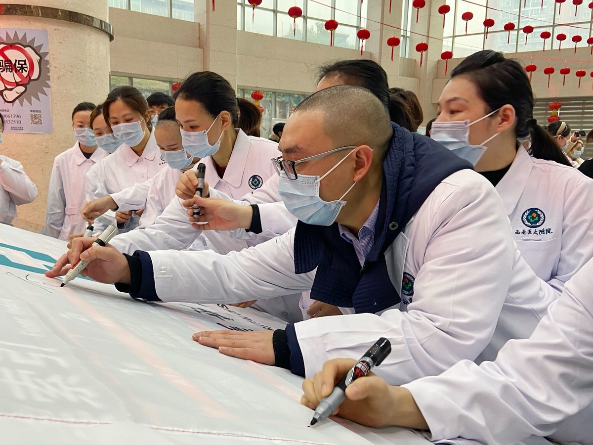 西南医科大学附属医院第三批支援湖北的医疗救援队20名医护人员在院旗上签上自己的名字。郭慧琳摄