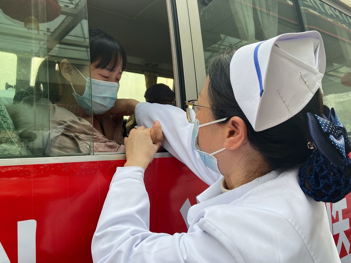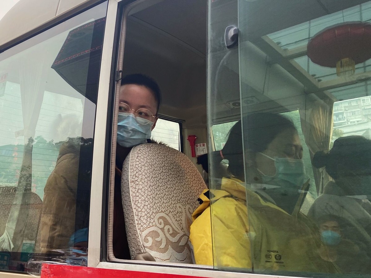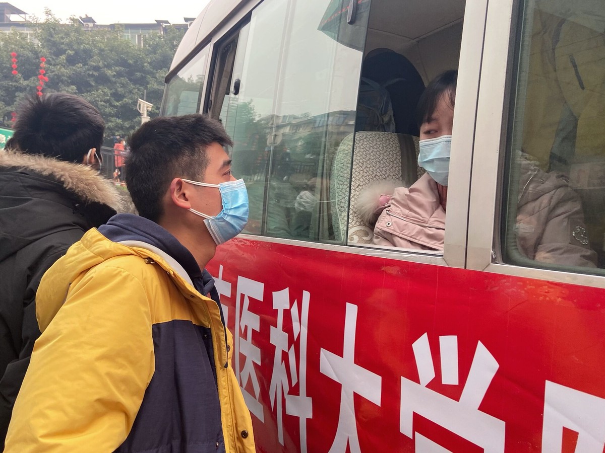 西南医科大学附属医院第三批支援湖北的医疗救援队乘上专车,临别前,依依不舍。郭慧琳摄