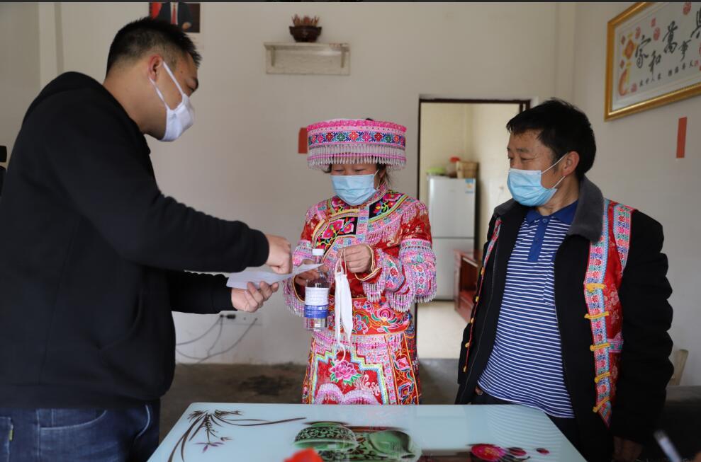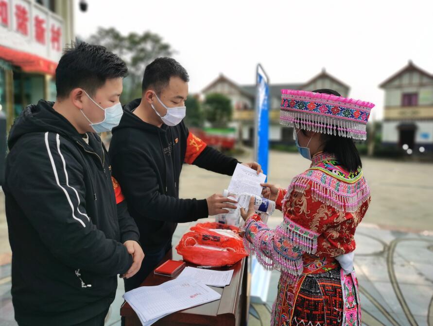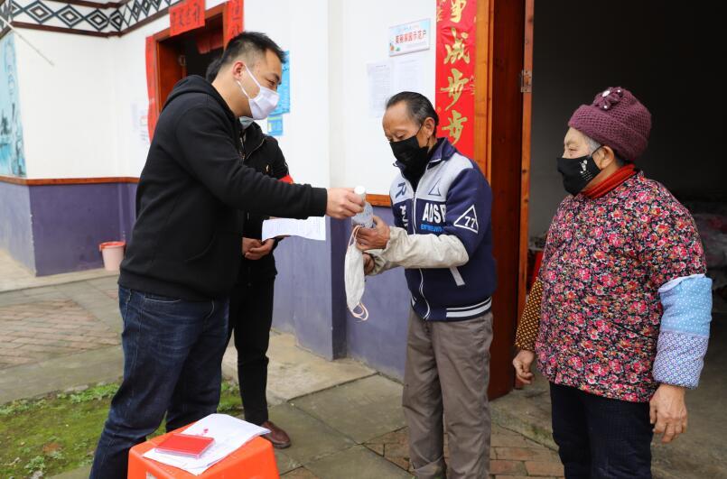 2月13日,在宜宾市兴文县古宋镇星火社区村的免费酒精发放处,苗汉同胞们陆续前来领取消毒酒精、使用温馨提示、自制口罩。针对行动不便、空巢老人等特殊群众,村组干部、志愿者把消毒酒精送上门。