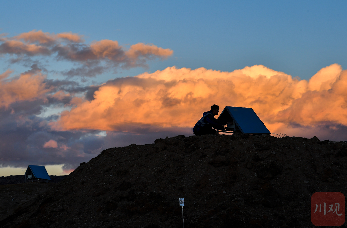 10月中旬,海拔4410米的甘孜州稻城县海子山气温已经降到了零摄氏度附近,中科院高能所副研究员侯超和组员们这些天都穿梭在这片布满了大小不一的花岗岩漂砾及形态各异的冰蚀岩盆的荒原上,检查一台台覆盖有绿色罩布的电磁粒子探测器。4年前,他们开始在这片荒原施工,如今已安装了5000多台电磁粒子探测器。