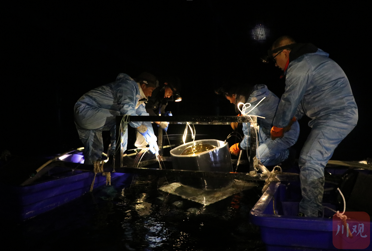 10月16日,科研人员在水切伦科夫探测器水池中安装光电倍增管,它们被固定“悬”在水下,接收“散落”水中且产生切伦科夫光的宇宙线。