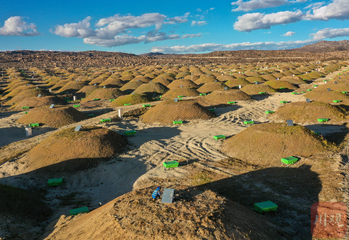 10月11日,放眼望去,观测基地周边均匀分布着壮观的土堆,这就是缪子探测器。每个土堆大概有36平方米大小,土堆下是一个直径6.8米、高1.2米的混凝土罐体,罐体中放置了装有超纯水的高反射率水袋。