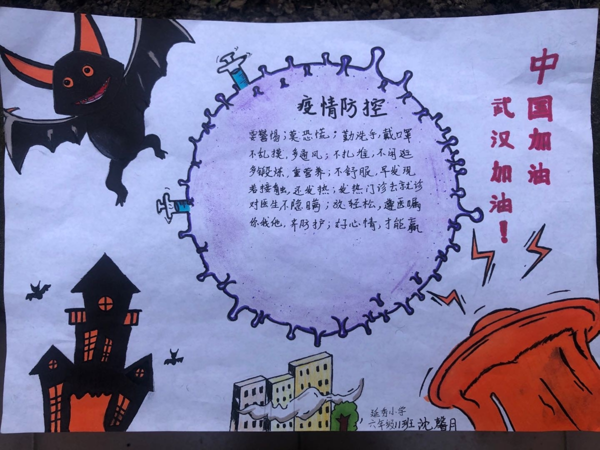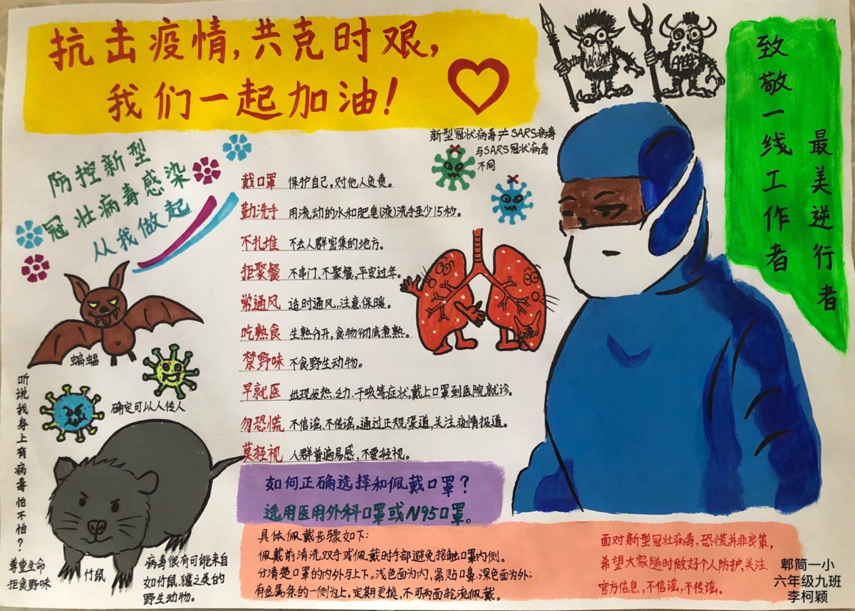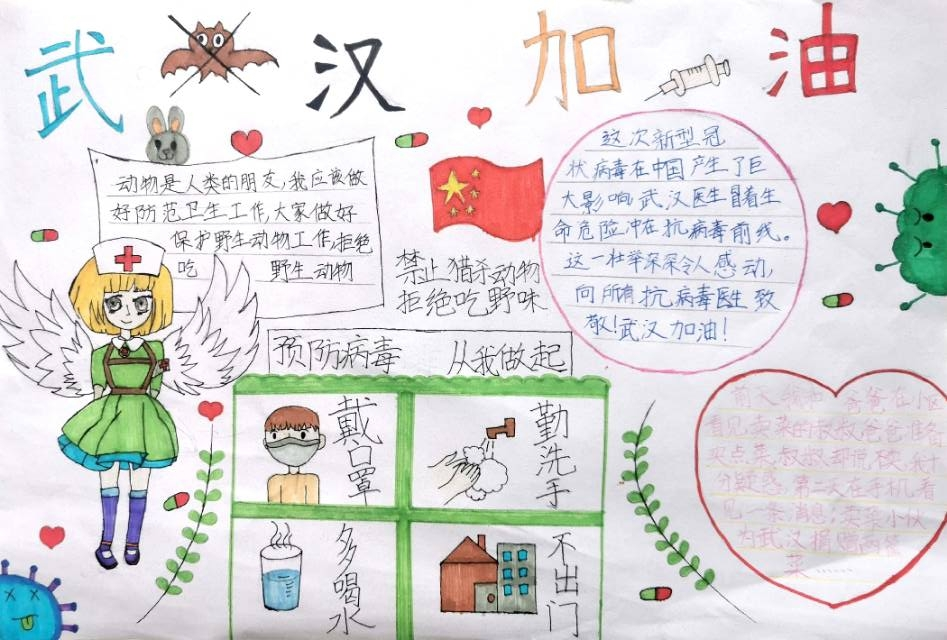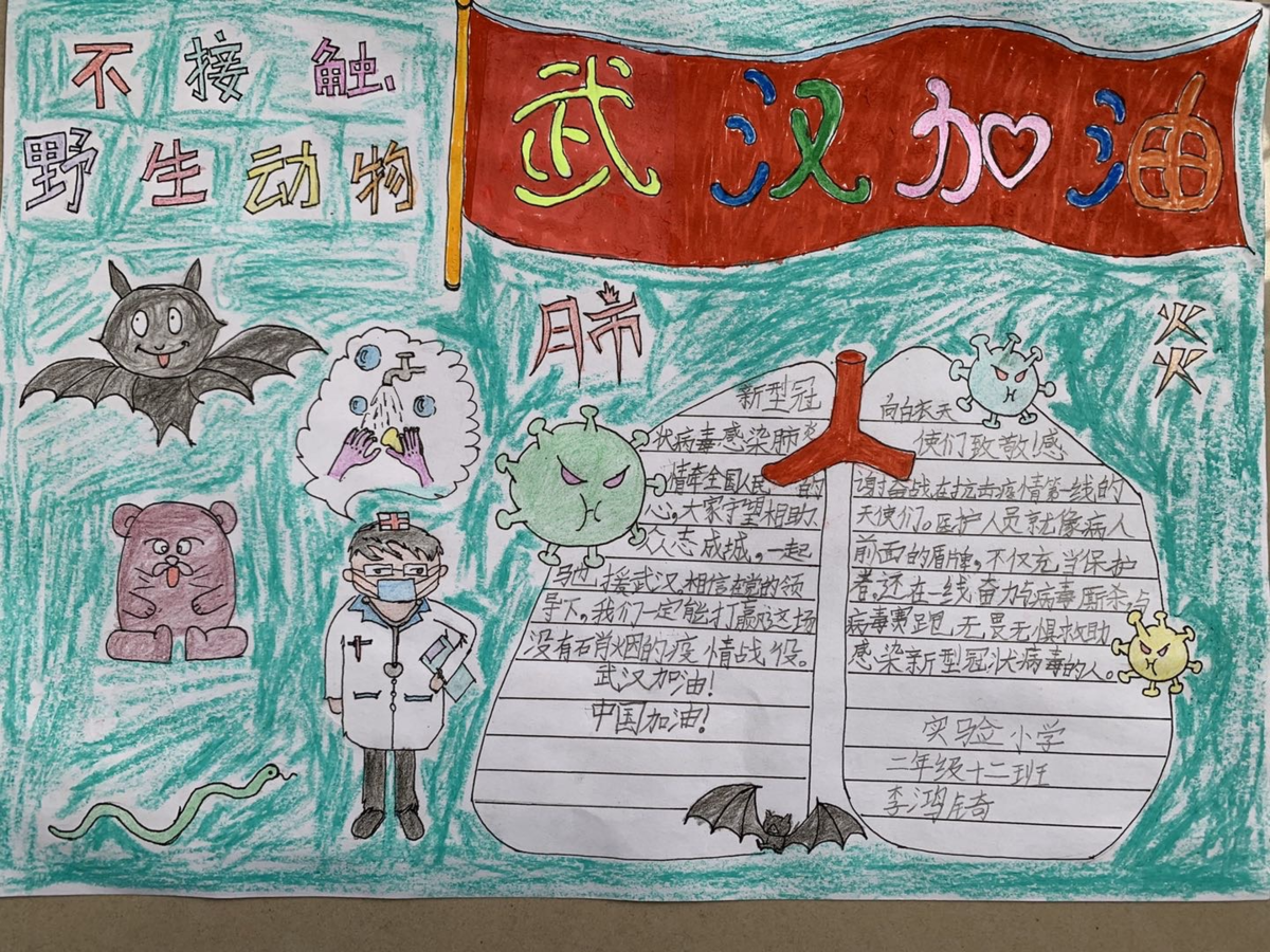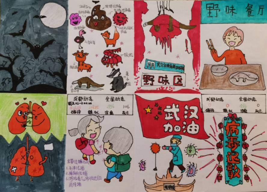 为了解释新型冠状病毒引起的肺炎和野生动物的关系,还有不少小朋友采用了知识密集型的创作方式——手抄报来呈现。(叔叔阿姨不禁感慨,报业后继有人啊!)