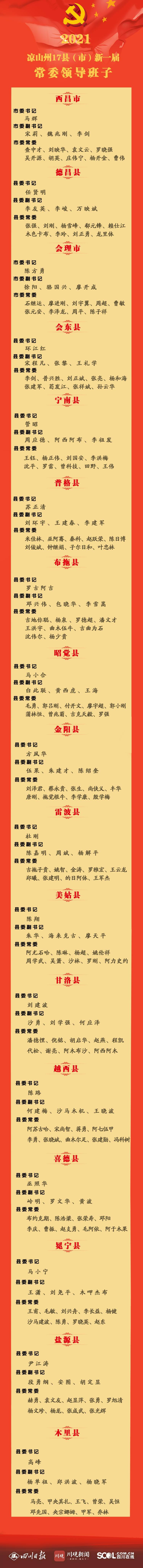 10月27日至11月30日,凉山州17县(市)陆续召开党代会,选举产生新一届县(市)委常委会。具体名单如下。