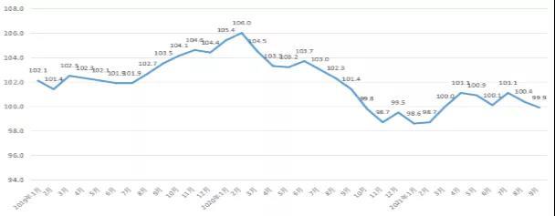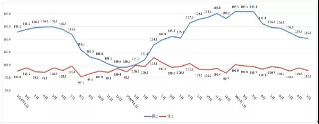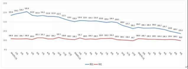 9月成都新建商品住宅环比指数为99.8,由涨转跌,同比指数为103.6,涨幅较上月收窄。二手住宅价格环比指数为100.1,同比指数为105.1,涨幅均较上月收窄。