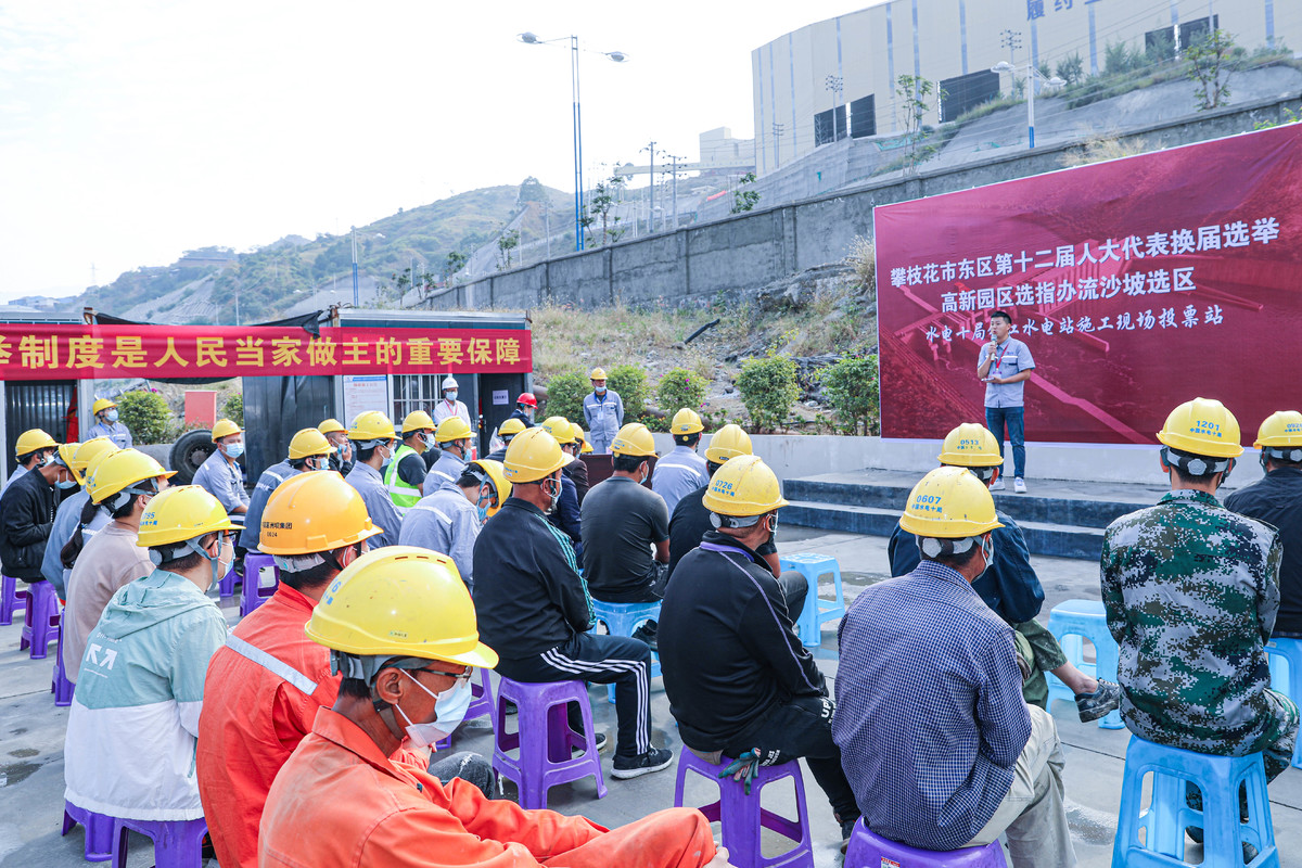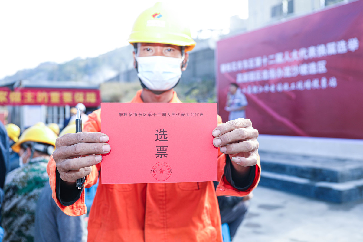 11月3日,攀枝花市东区第十二届人大代表换届选举日,参与银江水电站建设的外来务工人员骆宇航暂停手中工作,持选民证早早赶到高新园区选指办流沙坡选区水电十局银江水电站施工现场投票站,郑重投下庄严神圣的一票。
