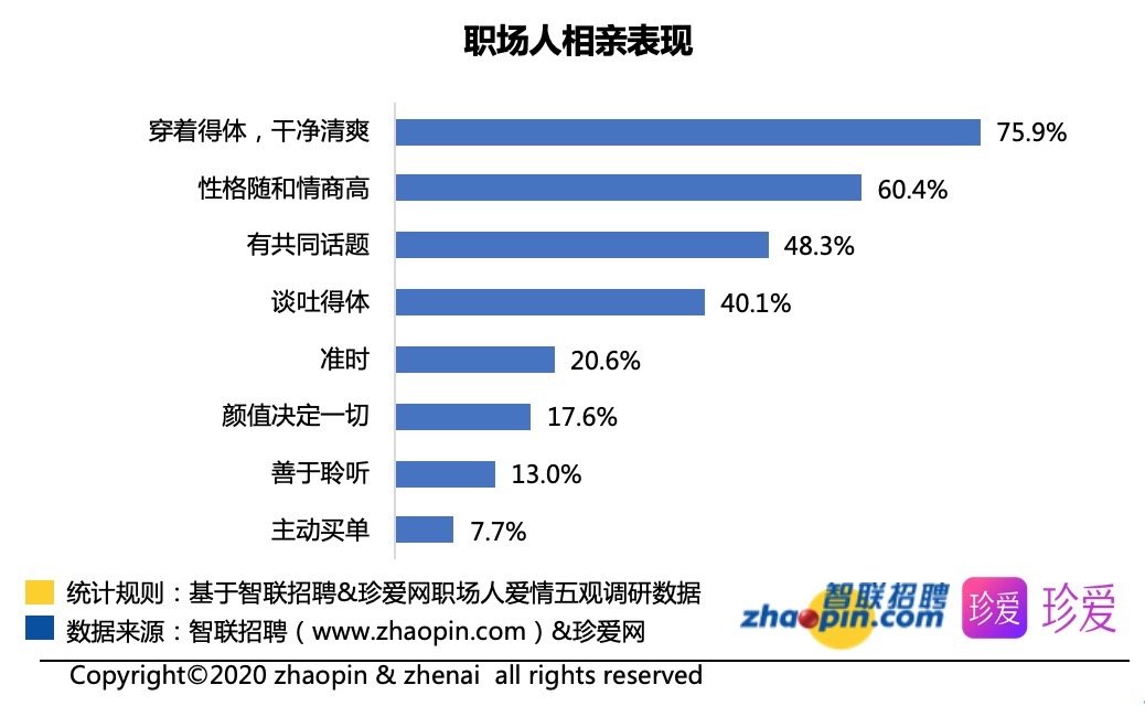 调查数据显示:白领相亲最多加分的项目是衣着得体干净清爽,占比为75.9%;紧跟其后的项目是性格随和高情商、有共同话题,分别占比60.4%与48.3%,颜值决定一切以17.6%排在倒数第三。