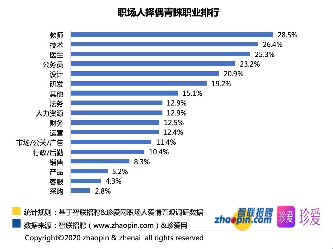数据显示,在择偶市场上最受欢迎的三个职业分别是教师、技术人员、医生。报告认为它们都属于文化层次高、技术含量高的职业,选择它们为择偶理想职业的占比为别为28.5%、26.4%、25.3%。