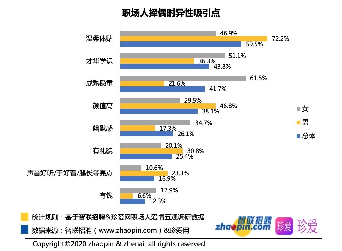 女性择偶则以技术38.2%、研发30.2%和医生26.7%为前三顺位,显示智力与知识担当在职场女性心目中的地位。报告认为,这三个职位通常收入高,职业前景好,社会地位也较高。
