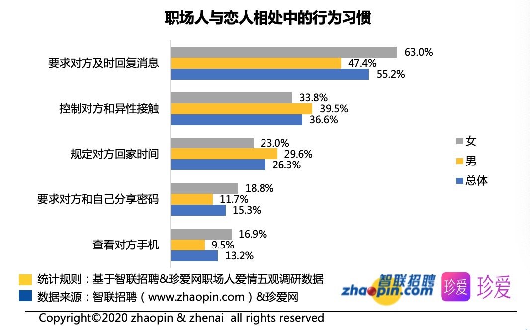 越是关系亲密的恋人,彼此之间的牵挂就越深。报告表明:职场恋人相处过程中最常见的“控制欲“行为前三排名为:要求对方秒回信息、控制对方和异性接触以及规定对方回家时间,占比分别为55.2%、36.6%、26.3%。