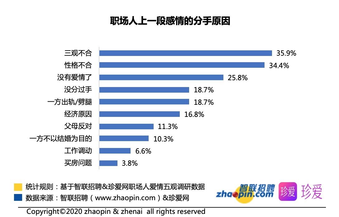 报告显示:导致职场人结束恋情排名最前的三大因素分别是三观不合(35.9%)、性格不合(34.4%)与没有爱情了(25.8%),三大要素皆属于主观因素。