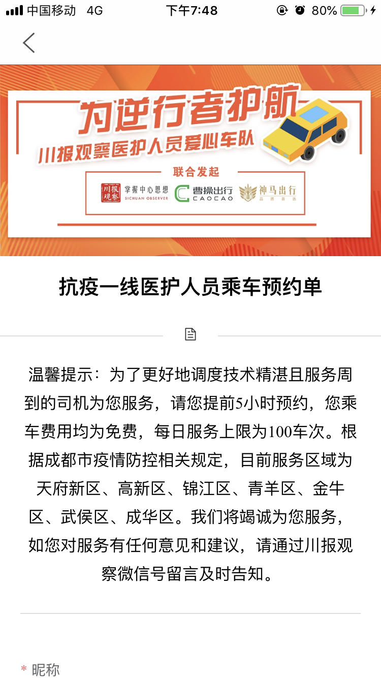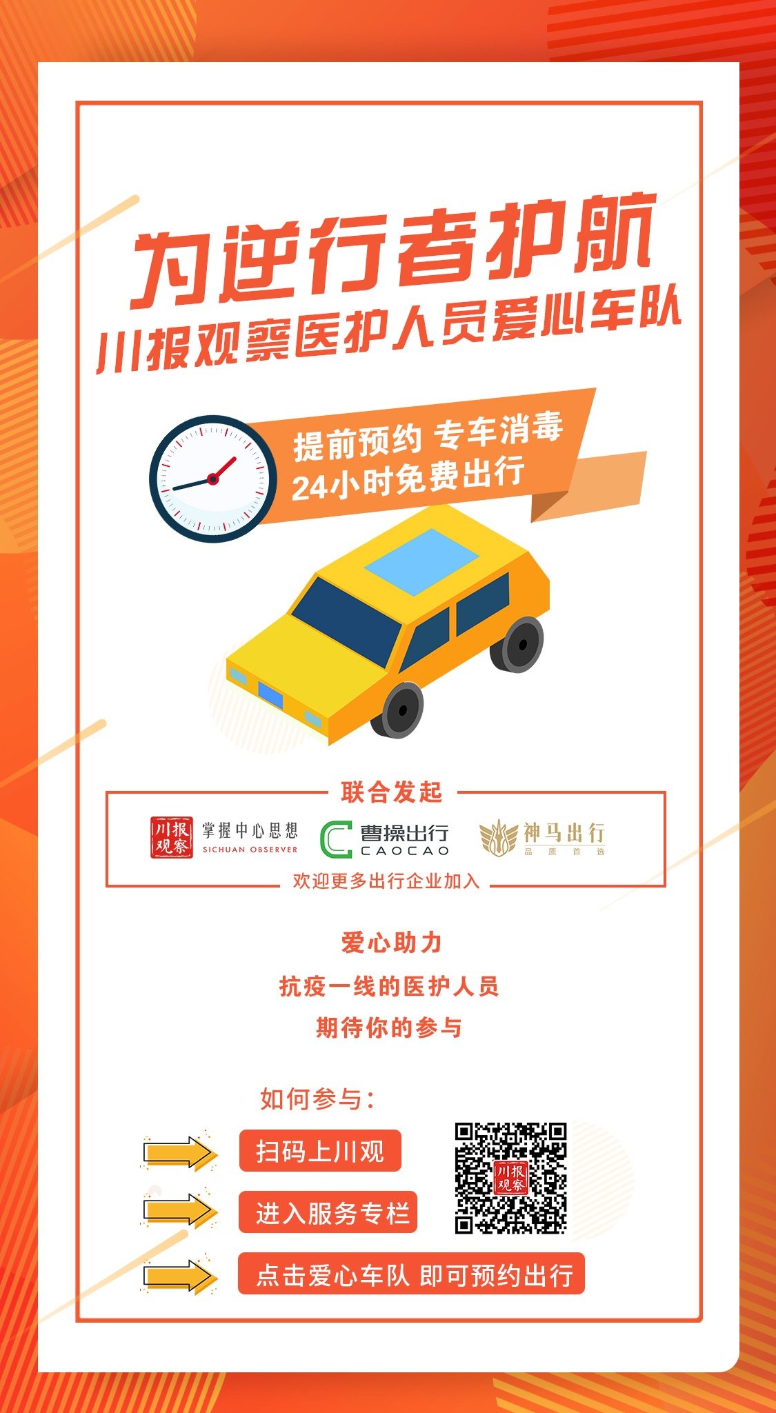 为关心和爱护奋战在一线的医护人员,全力保障他们的交通出行,川报观察联合曹操专车、神马专车等网约车平台,组建“医护人员爱心车队”,为医务人员上下班通勤和紧急出行提供免费服务,且服务时间24小时不间断。接送医护人员而产生的所有费用,均由曹操专车、神马专车等平台方出资赞助。
