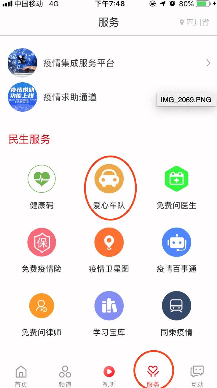 Step2:点击app底部“服务”专栏,点开“爱心车队”按钮