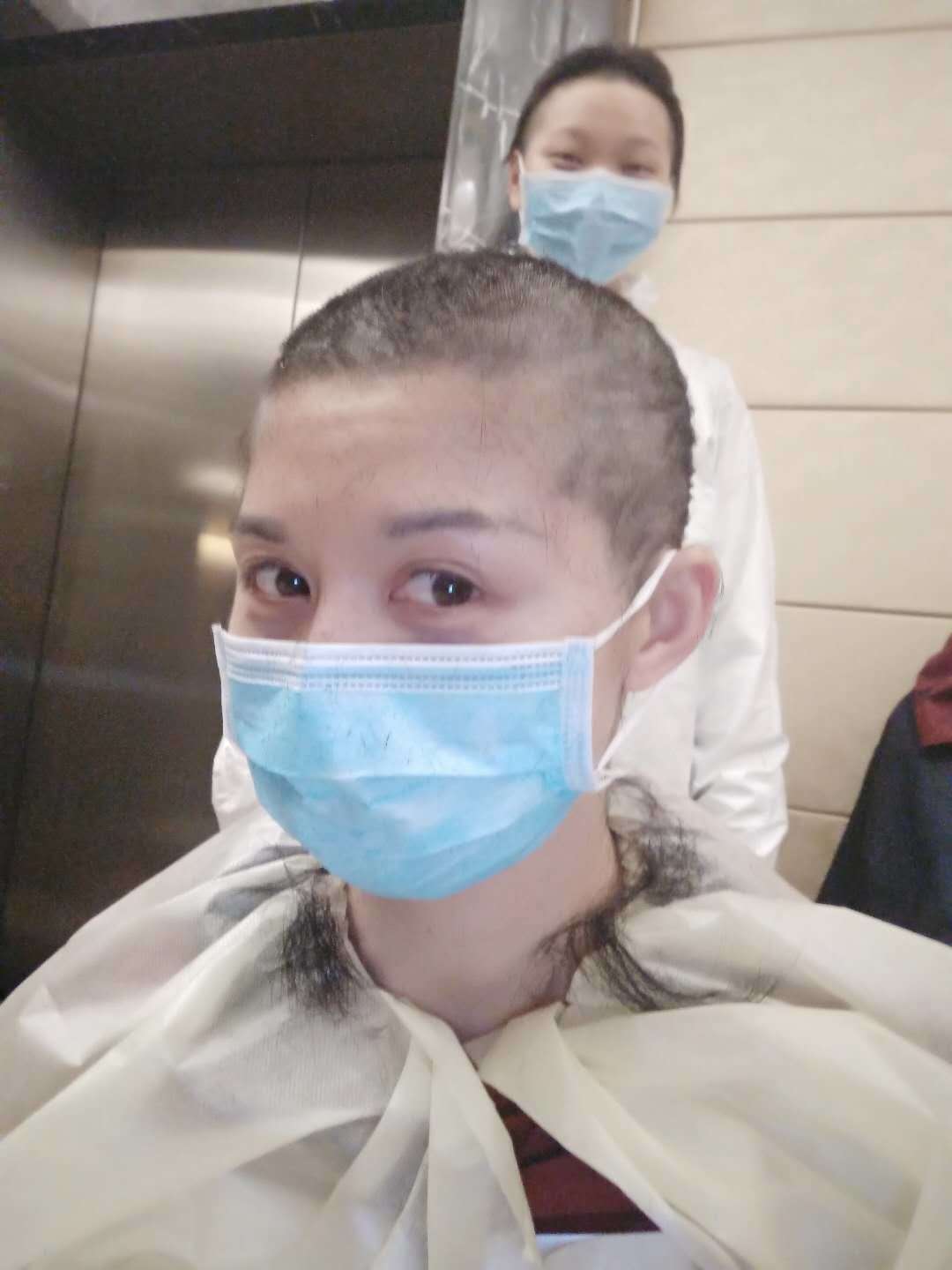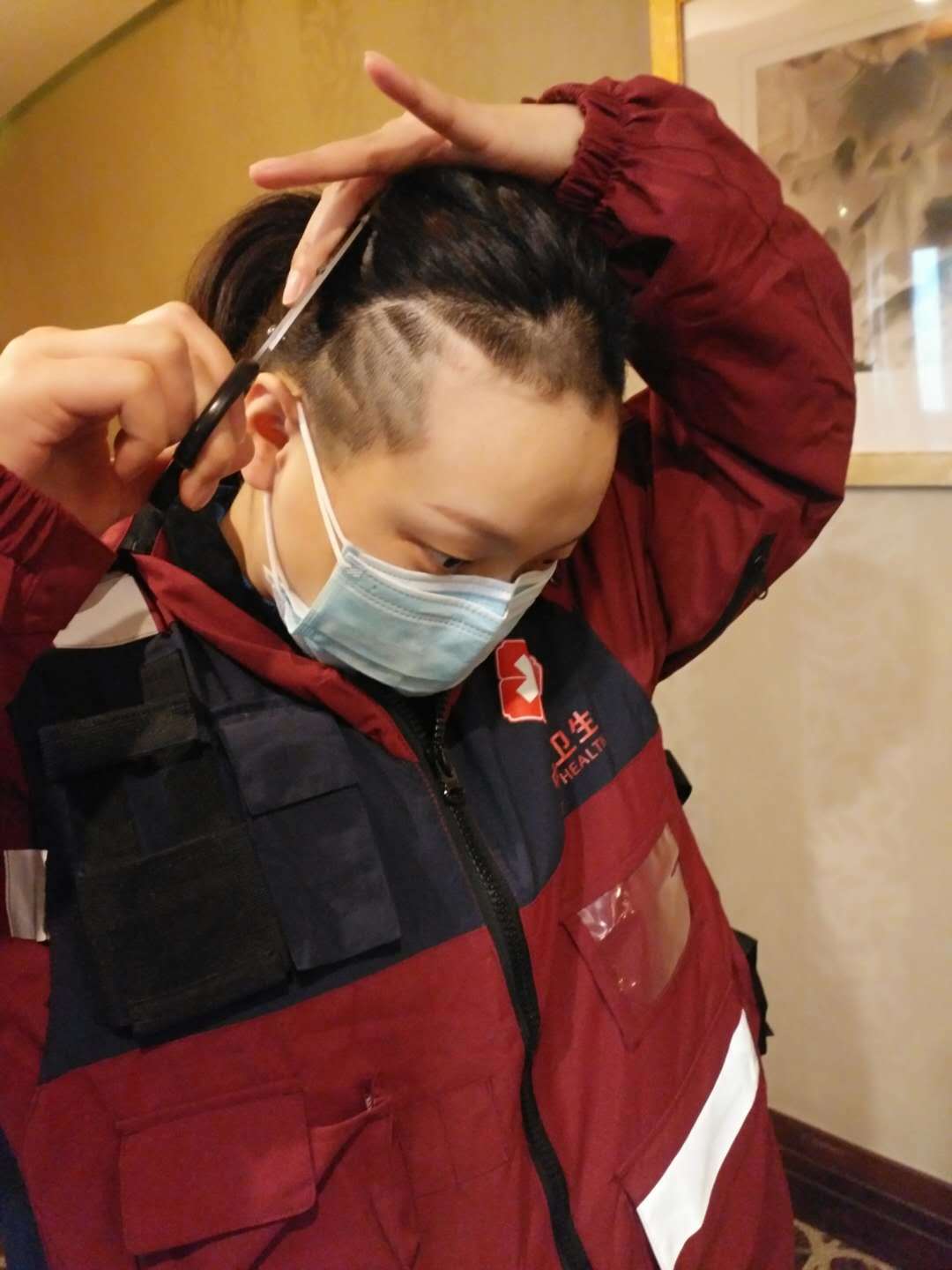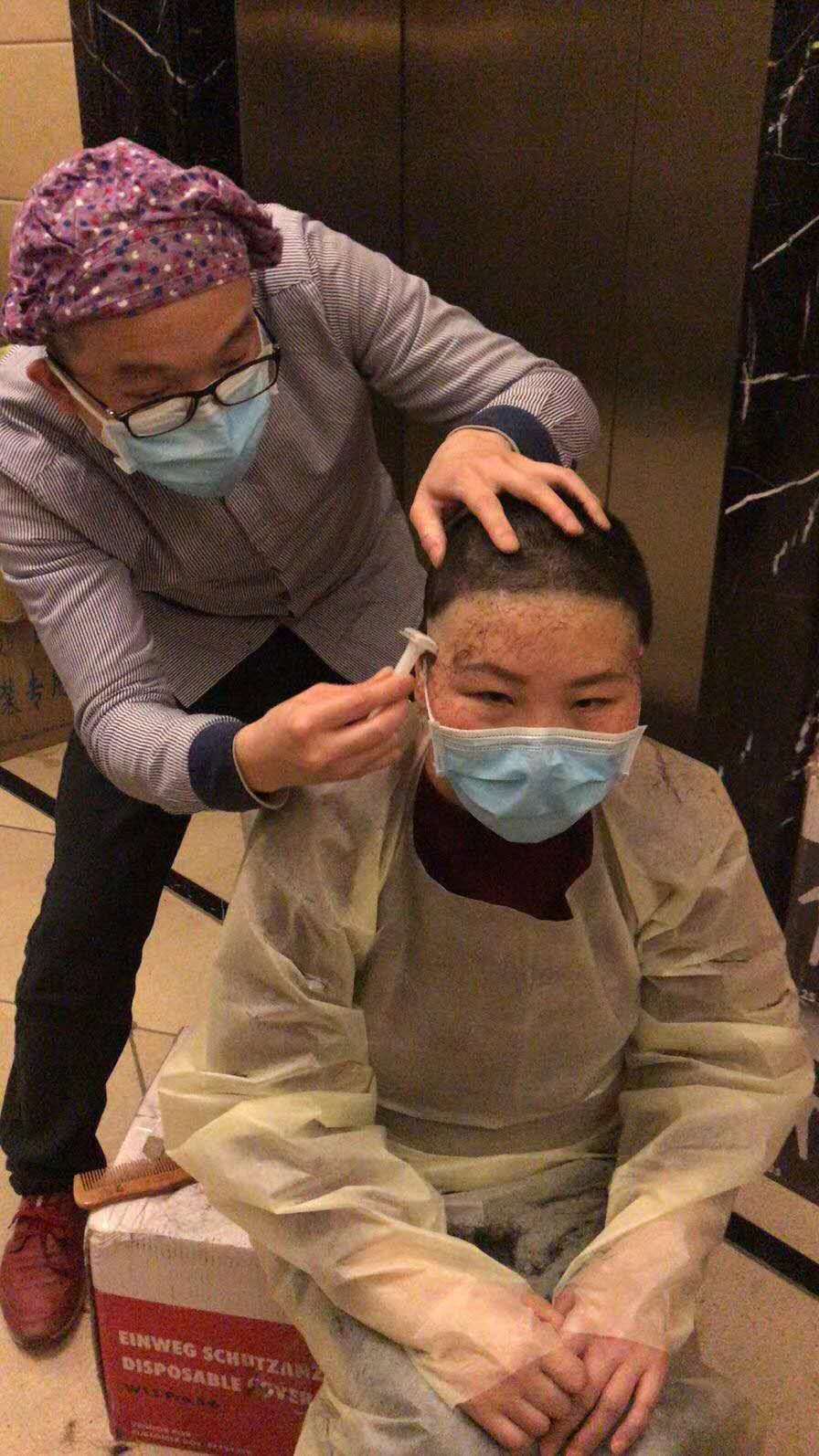 明天就要上“战场”了!2月14日下午,大竹县援助湖北医疗队队员在酒店剪掉留了多年的长发。