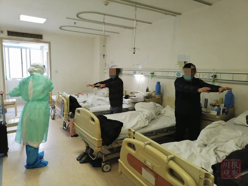 “虎爪,握拳,往上,再慢慢下来……”在武汉市红十字会医院10楼病房,一名新冠肺炎患者半坐在病床上活动上半身,练习起了“五禽戏”。病床旁,成都中医药大学附属医院重症医学科护士、四川援助湖北医疗队队员张思琪进行动作示范引导。