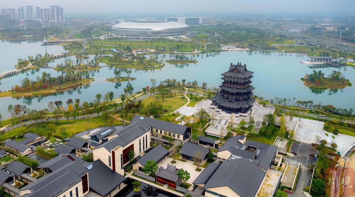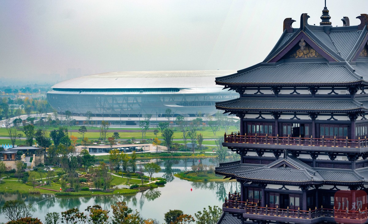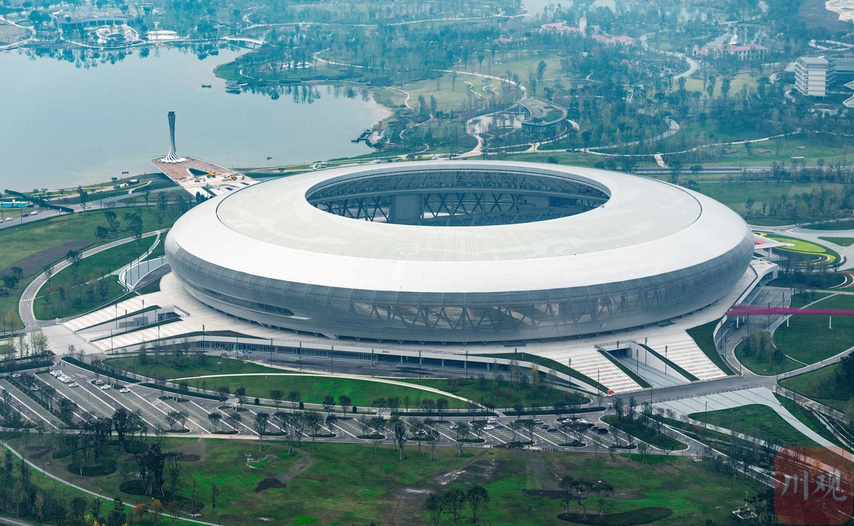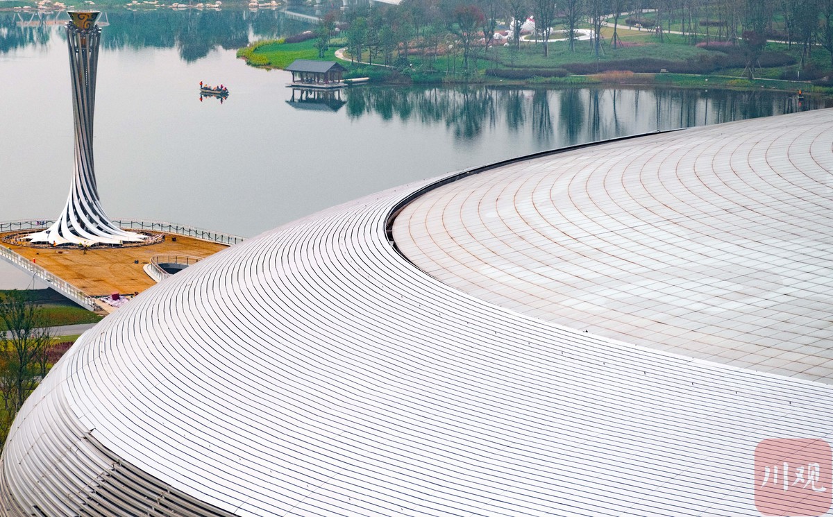 11月4日,“川观号”直升机飞抵东安湖体育公园上空,带您一揽千亩湖水的碧波荡漾,“一场三馆”的天圆地方,一窥成都公园城市示范区新地标的壮美景象。