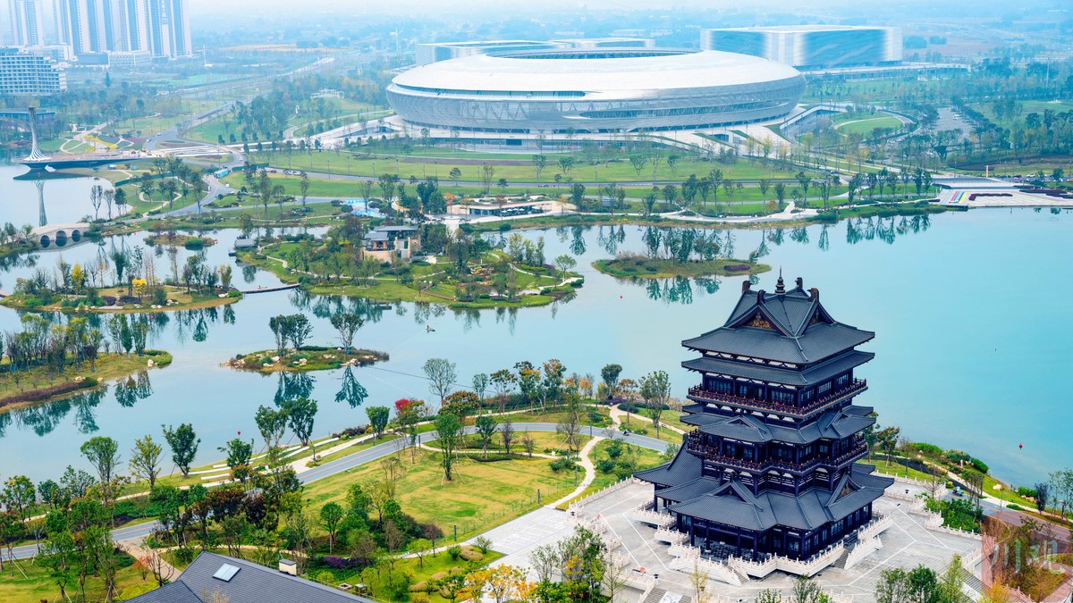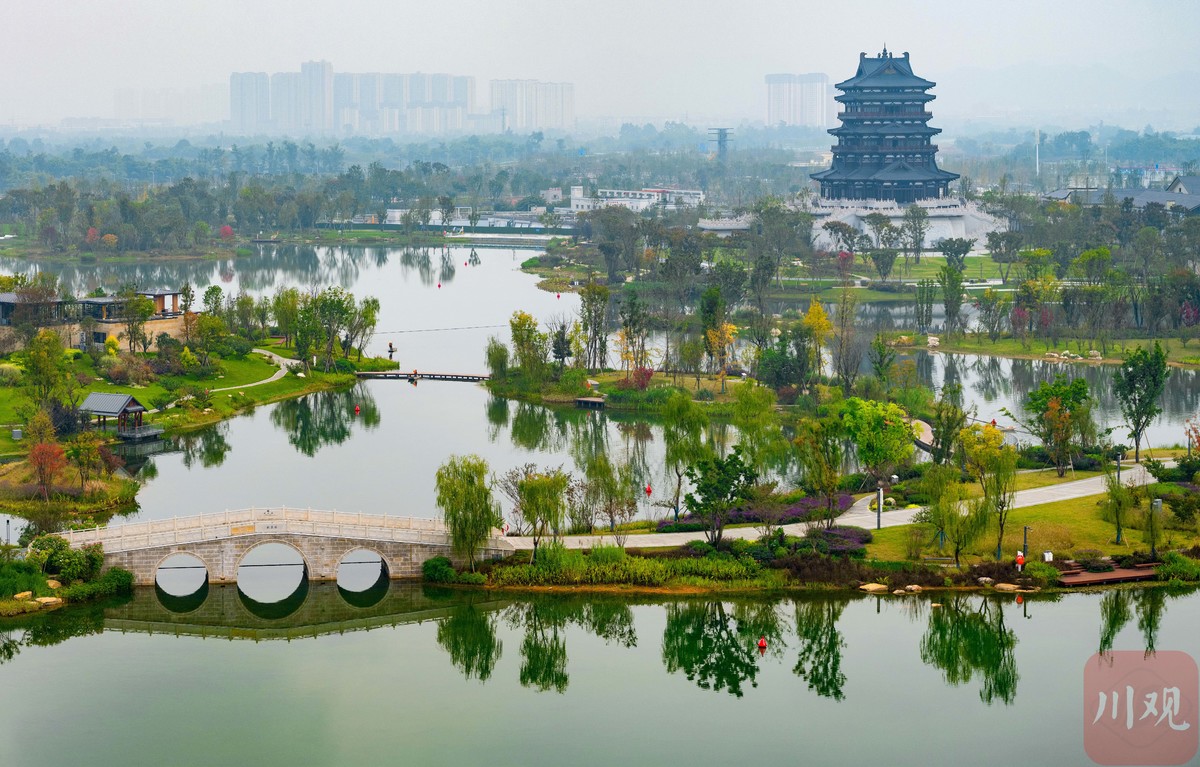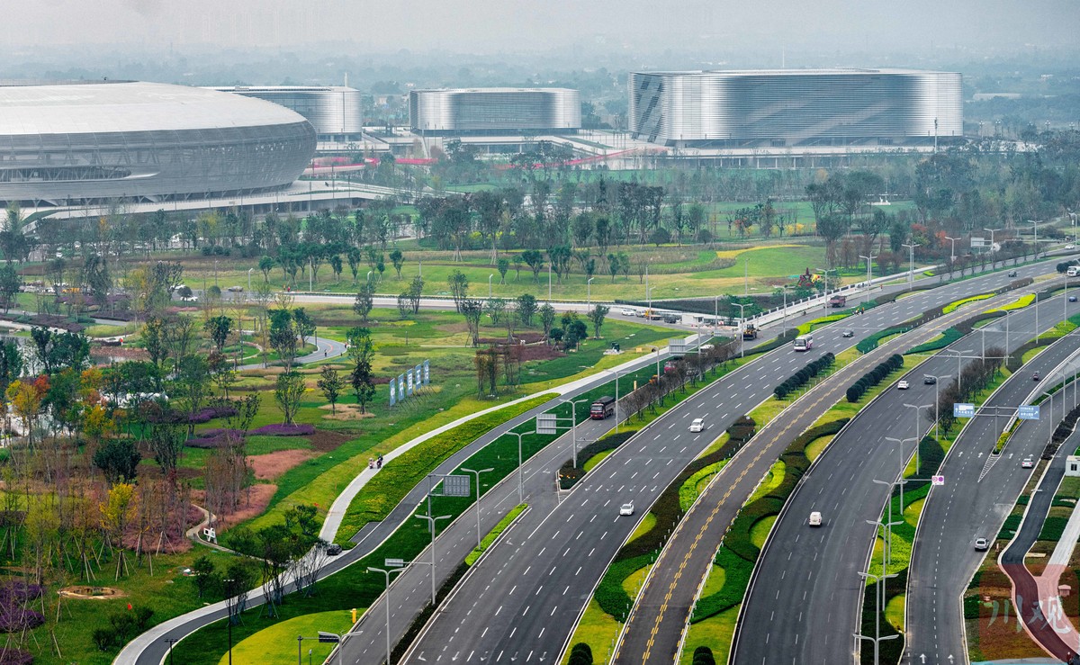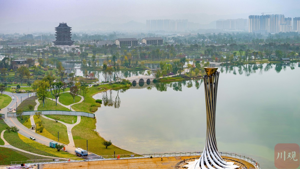 11月4日,“川观号”直升机飞抵东安湖体育公园上空,带您一揽千亩湖水的碧波荡漾,“一场三馆”的天圆地方,一窥成都公园城市示范区新地标的壮美景象。