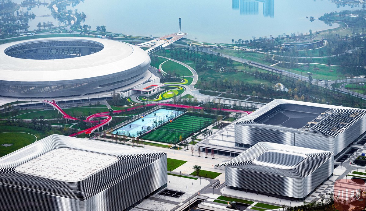 多功能体育馆、游泳跳水馆、综合小球馆的线条美组合成完美图案