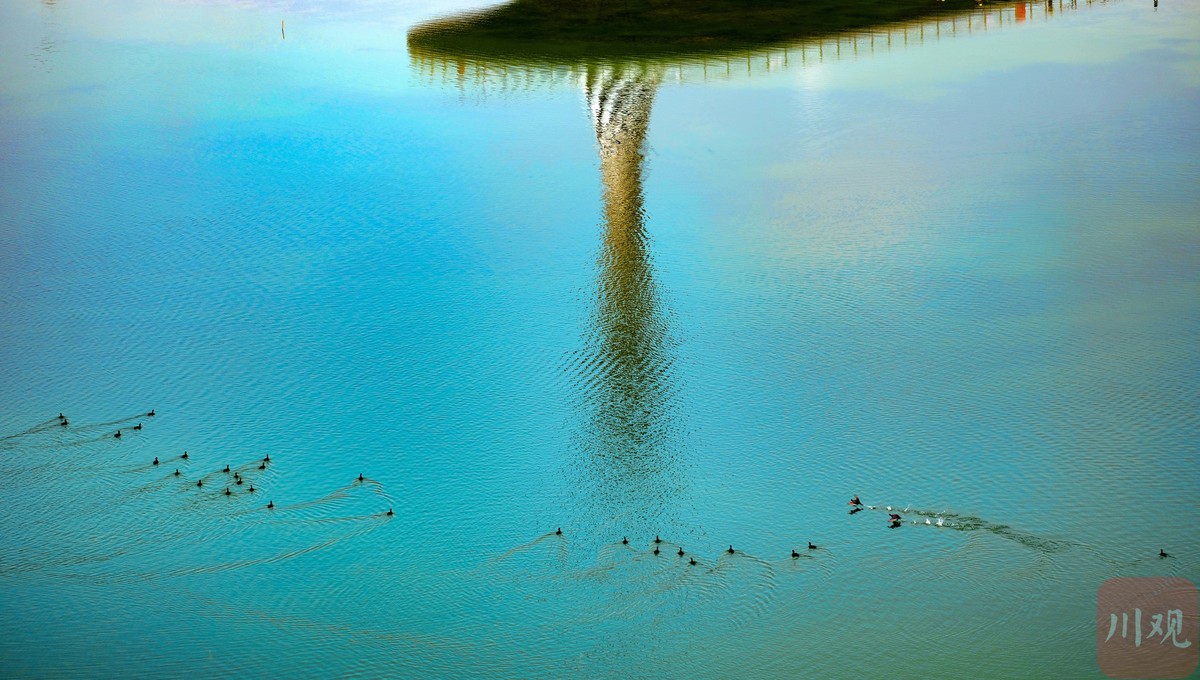 湖面上的野鸭群围绕着大运会火炬塔倒影嬉戏