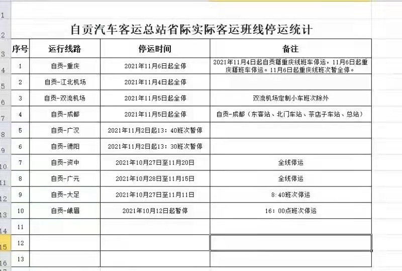 11月6日,川观新闻记者从自贡汽车客运总站获悉, 由于受疫情影响,自贡汽车客运总站从2021年11月7日起暂停发往成都、双流机场、重庆、江北机场、郫县客运班线,恢复运行时间另行通知。
