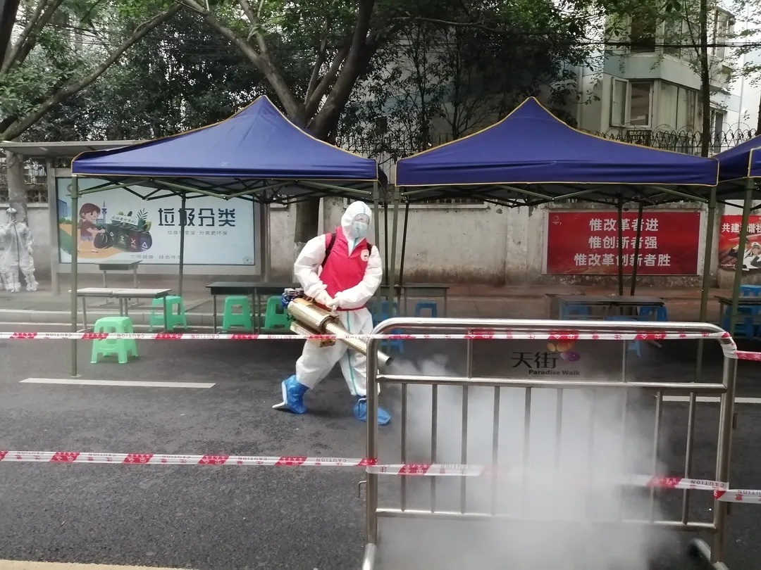 在金牛区疫情防控指挥部统一指挥调度下,队员们携带20多公斤重的喷洒设备,对该居民区及周边院落指定区域,进行专业消杀。一天之内,完成了管控及周边区域消毒灭菌面积达上万平方米。
