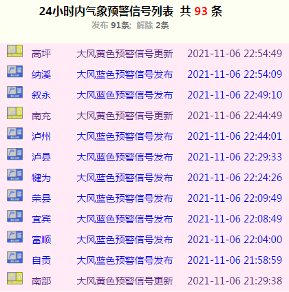 四川省公共气象服务网显示,自11月6日11时至22时50分,四川各地共发布91条大风预警信号。 截至记者发稿,有14个地方气象台将大风预警信号由“蓝色”升级“黄色”。