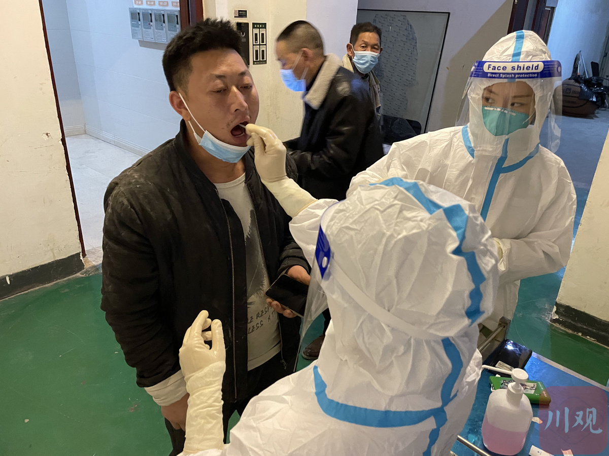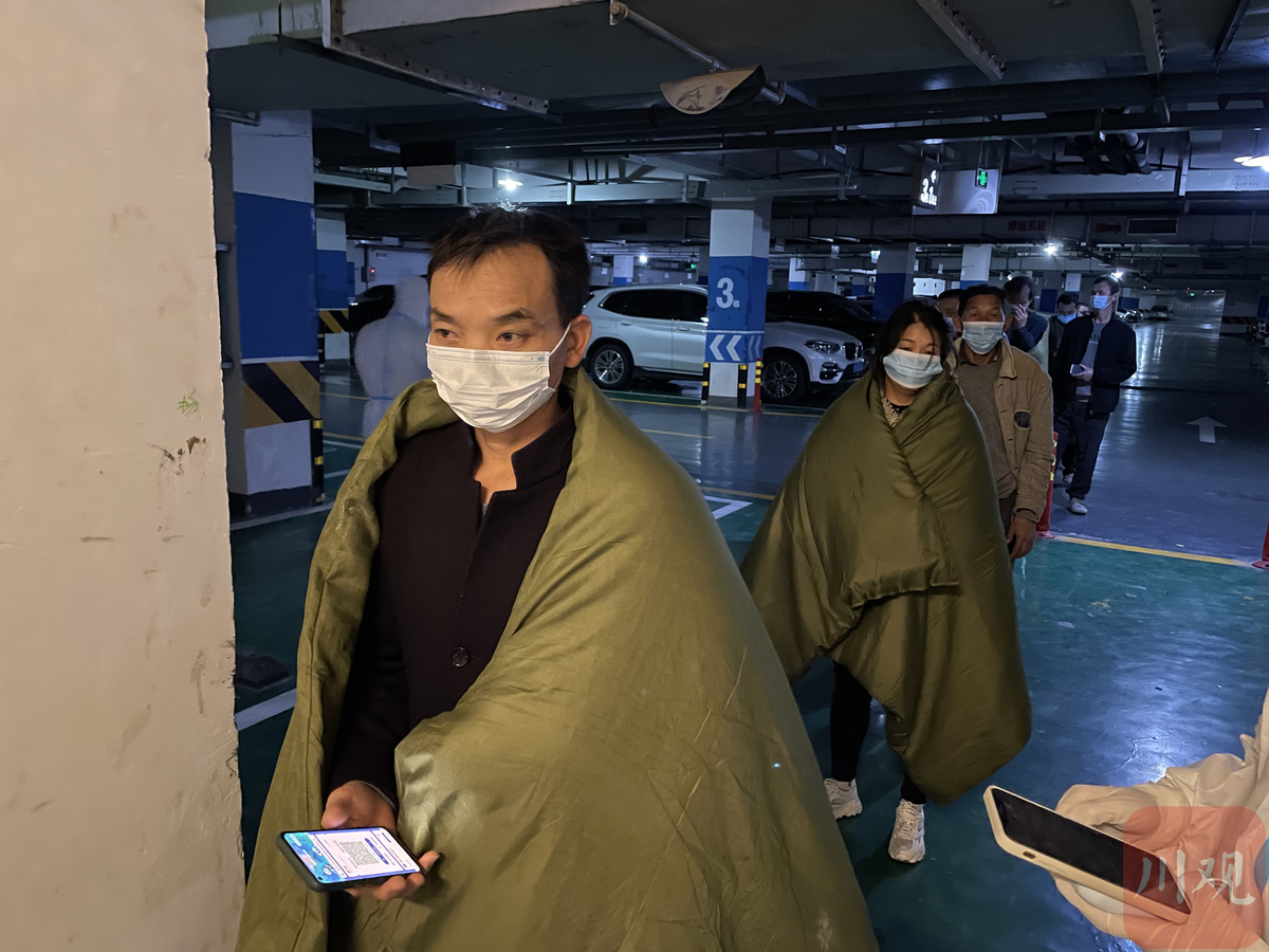 11月7日凌晨1点,成都高新区保利百合花园地下停车场,25名装修工人身披棉被,排队依次做核酸检测。