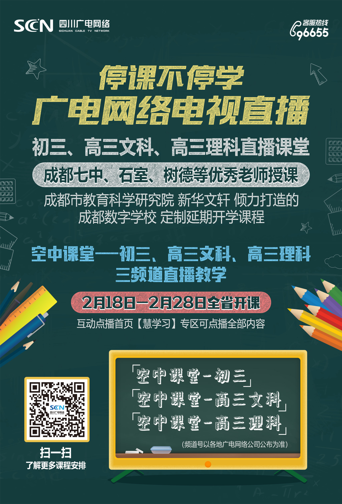 在绵阳,在保障好全省空中课堂三大直播频道的基础上,2月17日起,广电网络公司与绵阳市电教馆、绵阳市科教所合作开通的九个绵阳义务教育阶段电视空中同步课堂频道也已上线,内容涵盖1-9年级各学科各阶段同步课程,力保学生在疫情期间“学习不延期”;