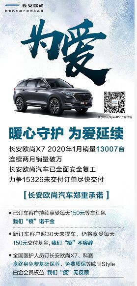 长安欧尚X7 2020年1月销量13007台,连续两月销量破万,热销态势,加之疫情影响,使其更加供不应求。已全面安全复工条件下,长安欧尚汽车为满足客户私家车出行的急切需求,加快生产,力争让15326个长安欧尚X7未交付订单客户尽快提车。