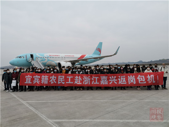 2月18日下午,一架从宜宾直达浙江的包机从宜宾五粮液机场起飞。来自宜宾全市的82名宜宾籍农民工免费乘坐包机赴浙江嘉兴返岗。