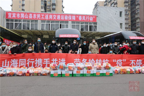 宜宾市人力资源和社会保障局农民工工作科科长李伟介绍,宜宾市和嘉兴是东西部劳务协作城市。此次为帮助农民工顺利返岗,宜宾市人力资源和社会保障局统筹协调,各区县出行的农民工逐一核实,并为未办理外出务工人员健康证明的人员协调,特事特办进行了办理,提供免费包车送到机场服务,并对出行人员发放了家乡特产慰问品。