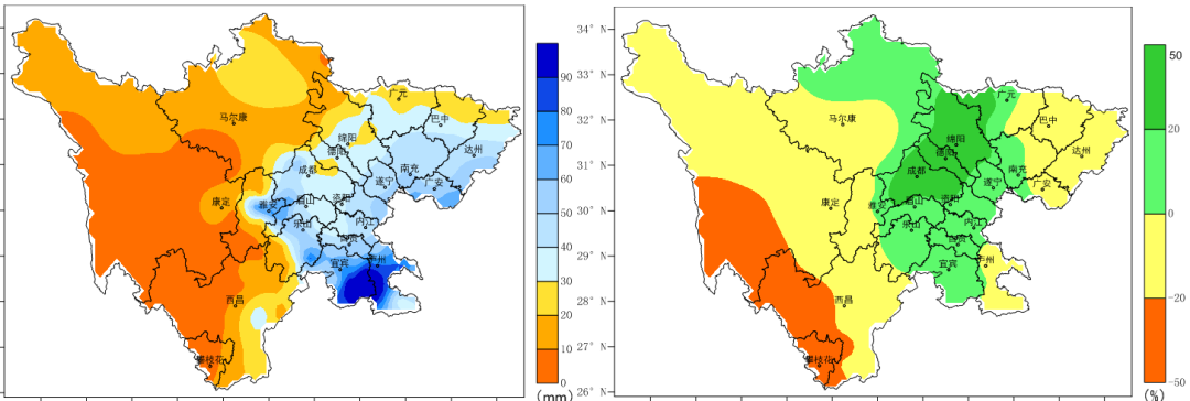 2021/2022年冬季我省川西高原北部、盆地西部、中部和南部降水量较常年同期偏多,其中盆地西北部降水量较常年同期异常偏多;川西高原西南部和攀西地区西部降水量较常年同期异常偏少。