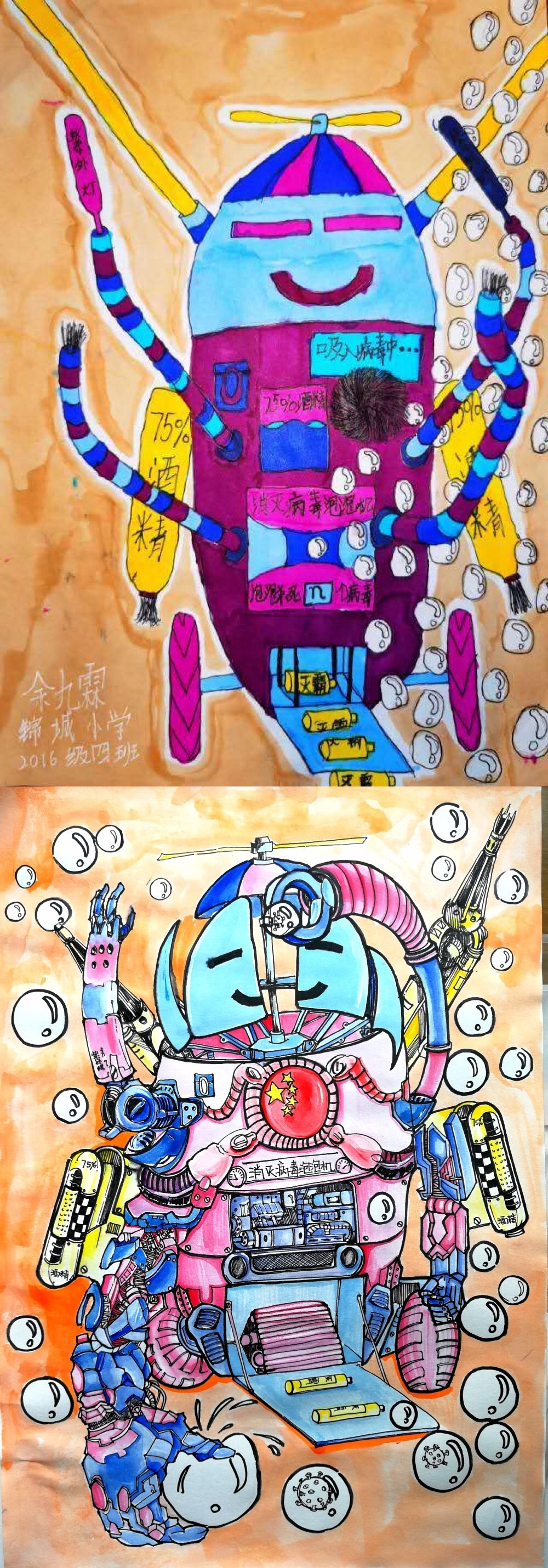 鲜艳明亮的色彩、大胆勾勒的线条、充满创意的机器人在消灭病毒……第一眼就被余九霖小朋友的画面所吸引。