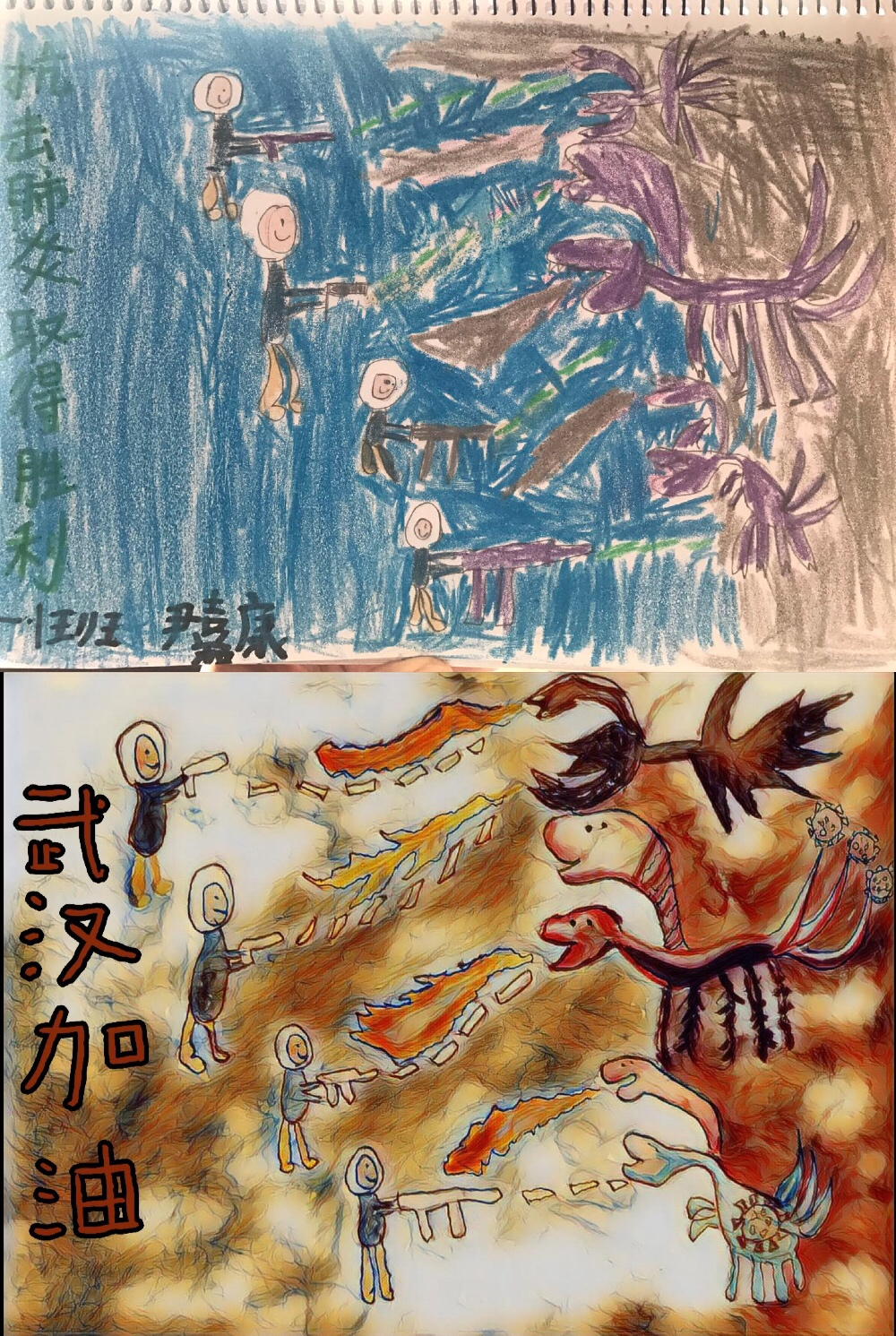 管晓州对这幅作品印象深刻。“颜色简略,但是笔法大胆!小朋友的画风反映了激战中的两股势力,能直观体现当前武汉抗疫战场水深火热的态势。”