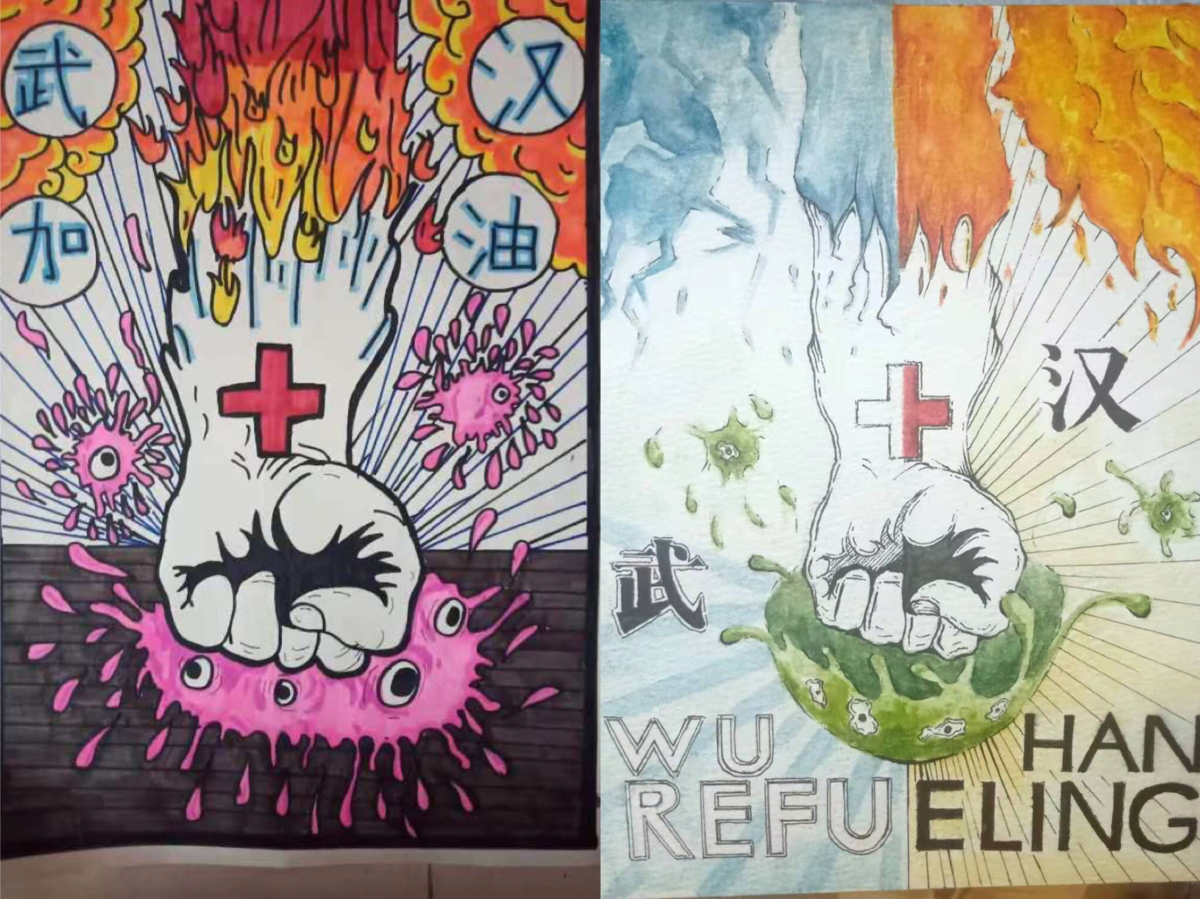 田丰老师说,这幅画看似变动不大,沿用了原有设计,但刘茂林同学很走心。他把握准了原作的瑕疵,巧妙地把“武汉加油”几个字打乱,用作画幅的底色,使其不再是单一的色彩,又含蓄有力地表现出主题。