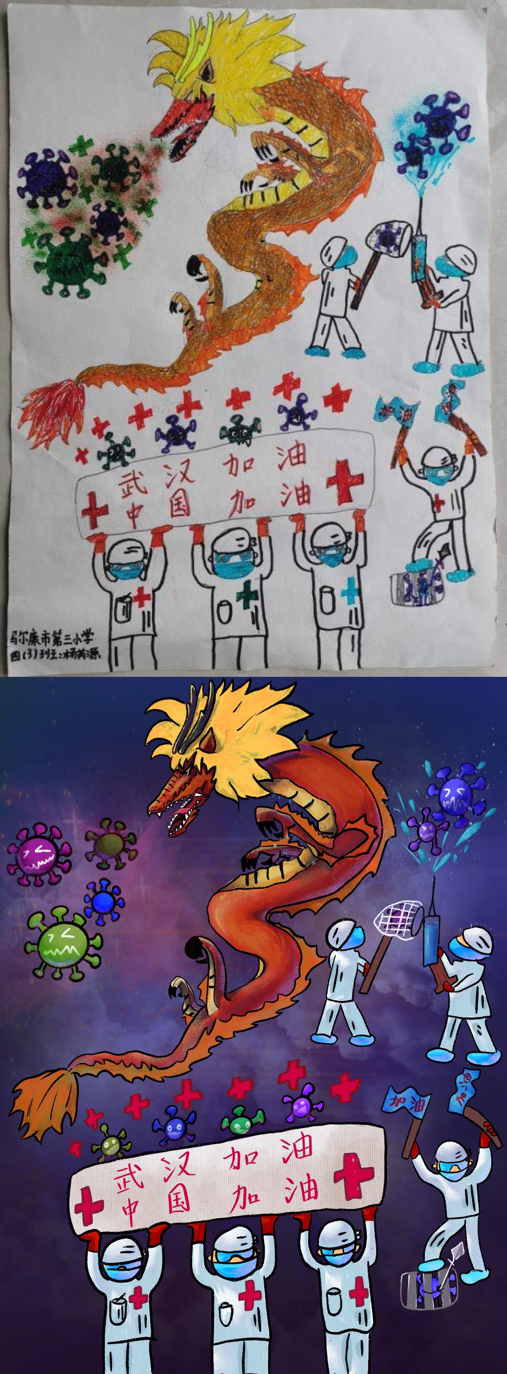 小朋友的原作意象丰富,正能量满满。田泳铭同学为画面增添了底色,也是战疫的精神底色。龙是中华民族的图腾,这个意象的选用,加上细致的再加工和大胆着色,画面呈现了敌弱我强的态势,极具感染力。