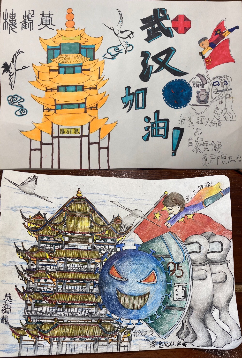 温福全同学基本沿用了小朋友的构图和线描手法。原作基础上,他增加了花、病毒的元素,花象征武汉,病毒象征这次疫情。既充实了画面,也向大家传递了祝福武汉和向往花开美好的积极情绪。