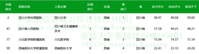 四川进入全国综合百强的四家医院分别是:排名第2位的四川大学华西医院、排名第47位的四川省人民医院、排名第77位的川北医学院附属医院以及排名第90位的西南医科大学附属医院。