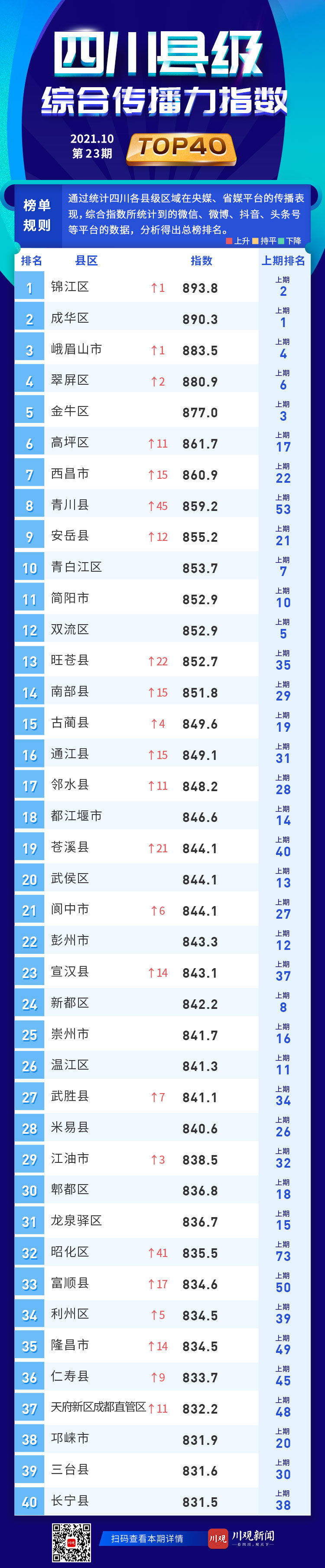 综合传播力指数前40名依次是:锦江区、成华区、峨眉山市、翠屏区、金牛区、高坪区、西昌市、青川县、安岳县、青白江区、简阳市、双流区、旺苍县、南部县、古蔺县、通江县、邻水县、都江堰市、苍溪县、武侯区、阆中市、彭州市、宣汉县、新都区、崇州市、温江区、武胜县、米易县、江油市、郫都区、龙泉驿区、昭化区、富顺县、利州区、隆昌市、仁寿县、天府新区成都直管区、邛崃市、三台县、长宁县