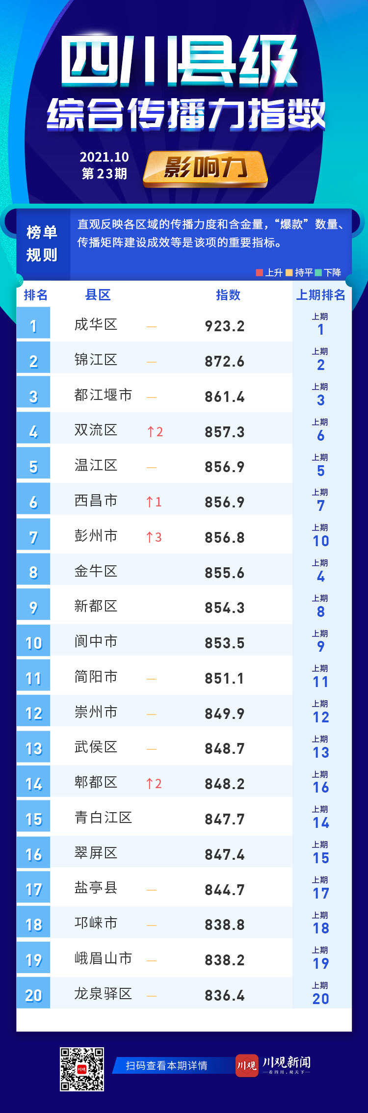 影响力前20名依次是:成华区、锦江区、都江堰市、双流区、温江区、西昌市、彭州市、金牛区、新都区、阆中市、简阳市、崇州市、武侯区、郫都区、青白江区、翠屏区、盐亭县、邛崃市、峨眉山市、龙泉驿区
