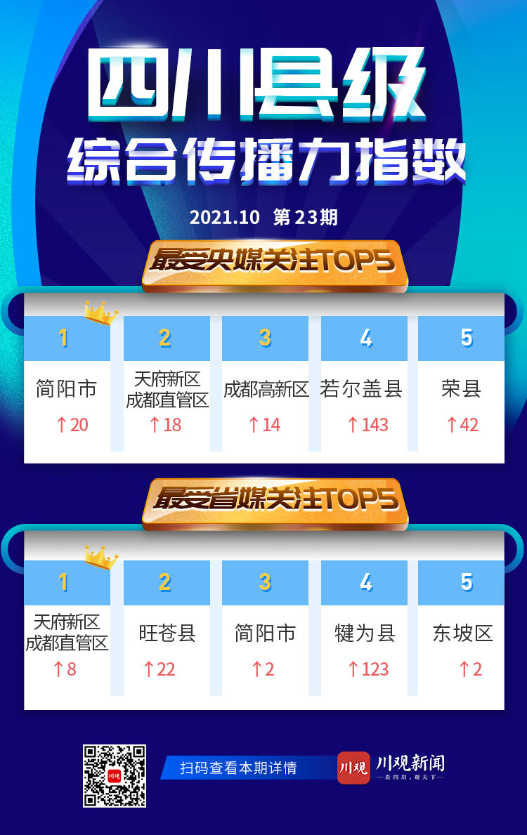 11月12日,四川县级综合传播力指数第23期(2021年10月)发布。本期指数的数据采集时间段是2021年10月1日至10月31日,共涉及3.3万余个有效活跃账号,79.5万余篇文章(视频,网页)。