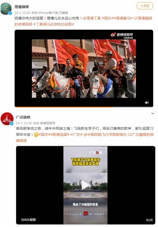 四川各地国旗飘扬、花团锦簇,开展了多种形式国庆节主题活动,如微博“理塘融媒”和“广汉融媒”的《祝福你伟大的祖国!理塘儿女永远心向党!》《乘百舸争流之势,续中华民族之魂!飞院新生学子们,用自己嘹亮的歌声,献礼祖国72周年华诞!》等新闻,报道了当地组织开展的赛马巡游、大学新生大合唱活动,为祖国母亲庆生。微信“安岳融媒”的《我爱你,中国!安岳师生用不同方式为祖国送祝福!》、“今日船山”的《视频|祝福祖国 为幸福奋斗》,表达对祖国的祝福和对美好未来的期盼。