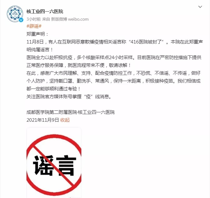 11月9日,成都医学院第二附属医院·核工业四一六医院发布消息称,11月8日,有人在互联网恶意散播疫情相关谣言称“416医院被封了”。医院在此郑重声明纯属谣言!