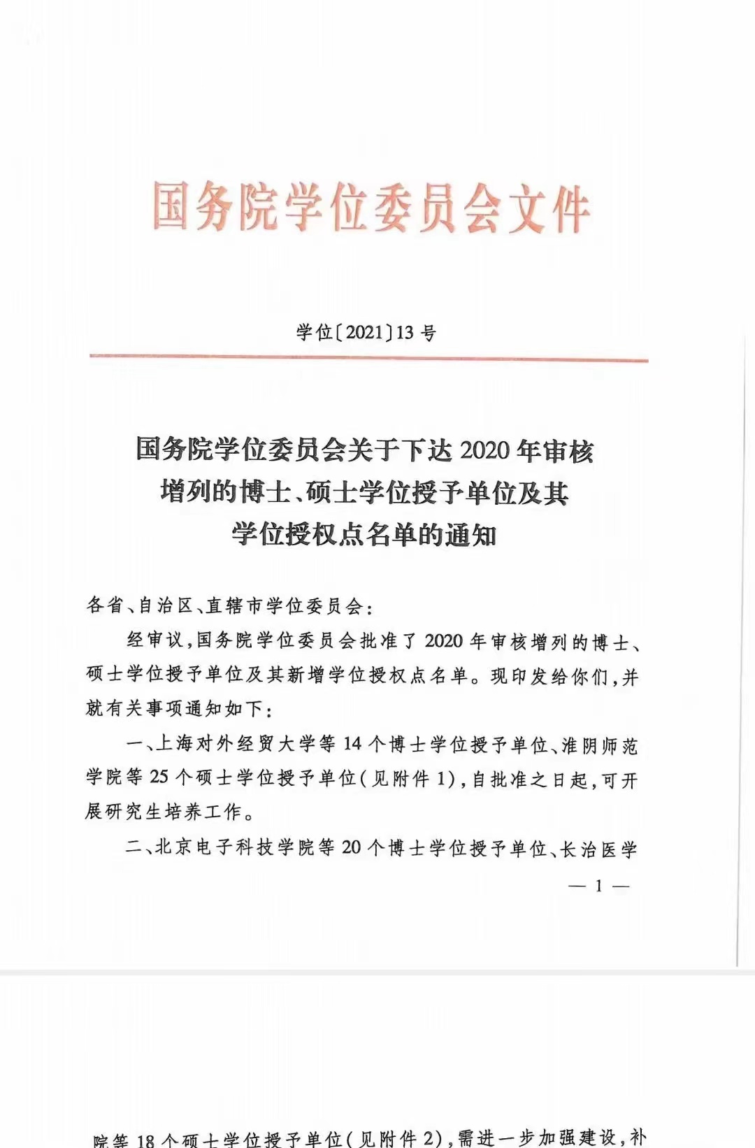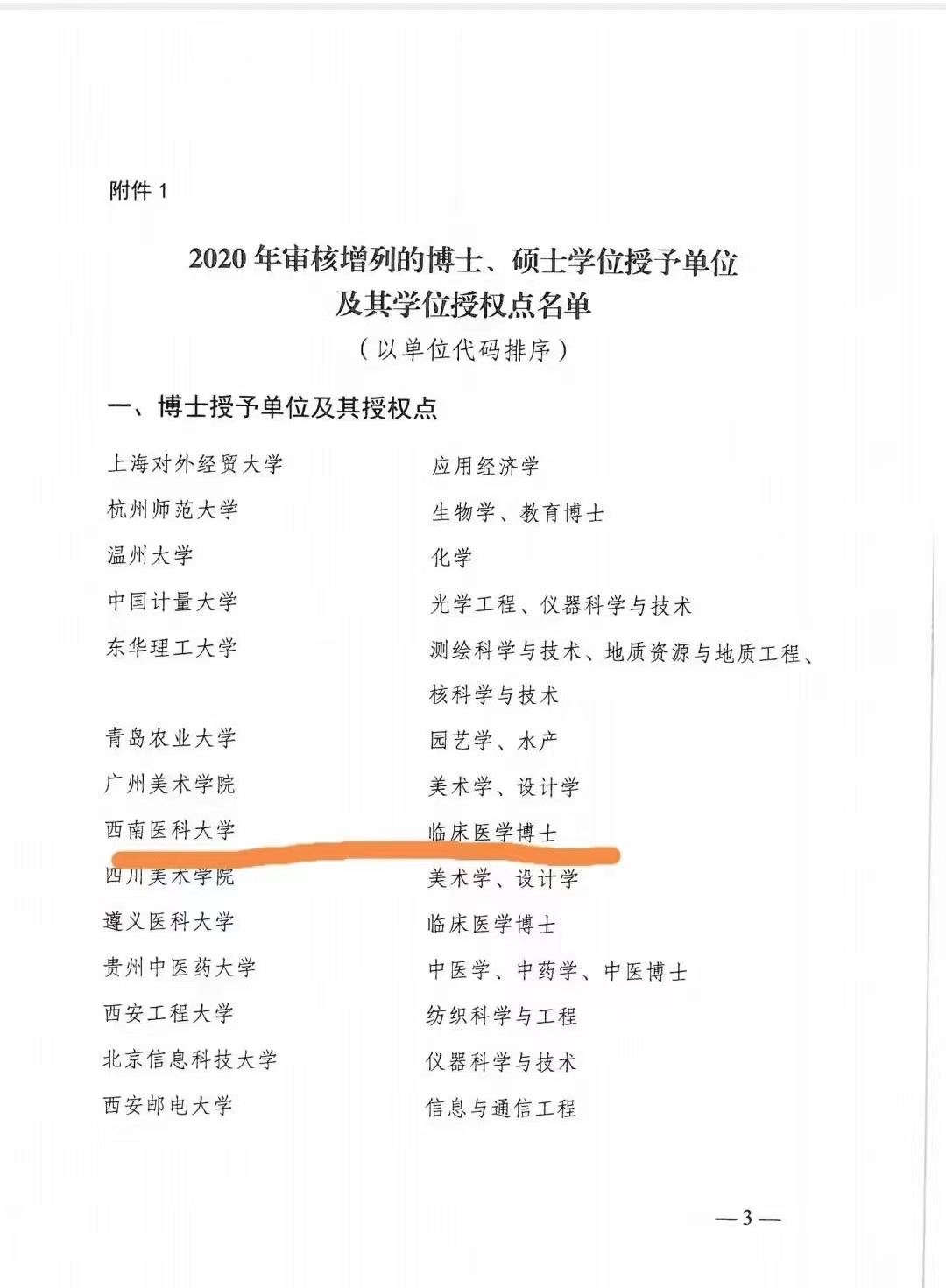 近日,笔者从国务院学位委员会下发《国务院学位委员会关于下达2020年审核增列的博士、硕士学位授予单位及其学位授权点名单的通知》(学位〔2021〕13号)中获悉,经国务院学位委员会正式批准西南医科大学为博士学位授予单位,临床医学1个学科为博士学位授权学科。